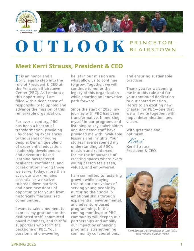 The Princeton-Blairstown Center's printed semi-annual newsletter Outlook includes the stories of staff and participants, introduces current topics in social & emotional learning, and provides other updates on the Center. Please click on the links below to read and enter your email address at the bottom to join our eNewsletter subscription list.